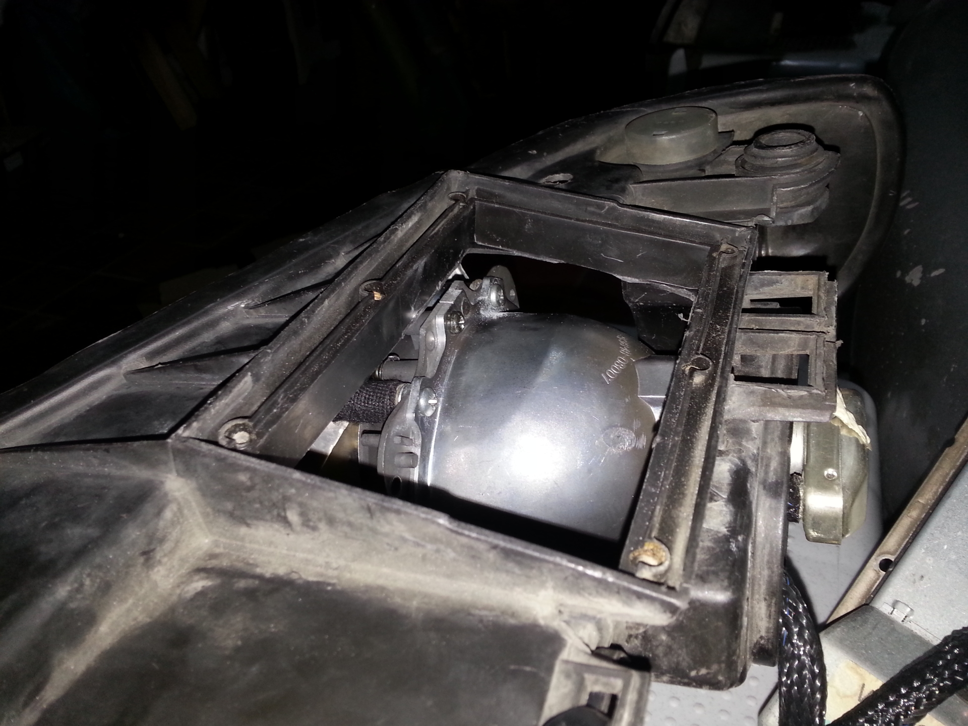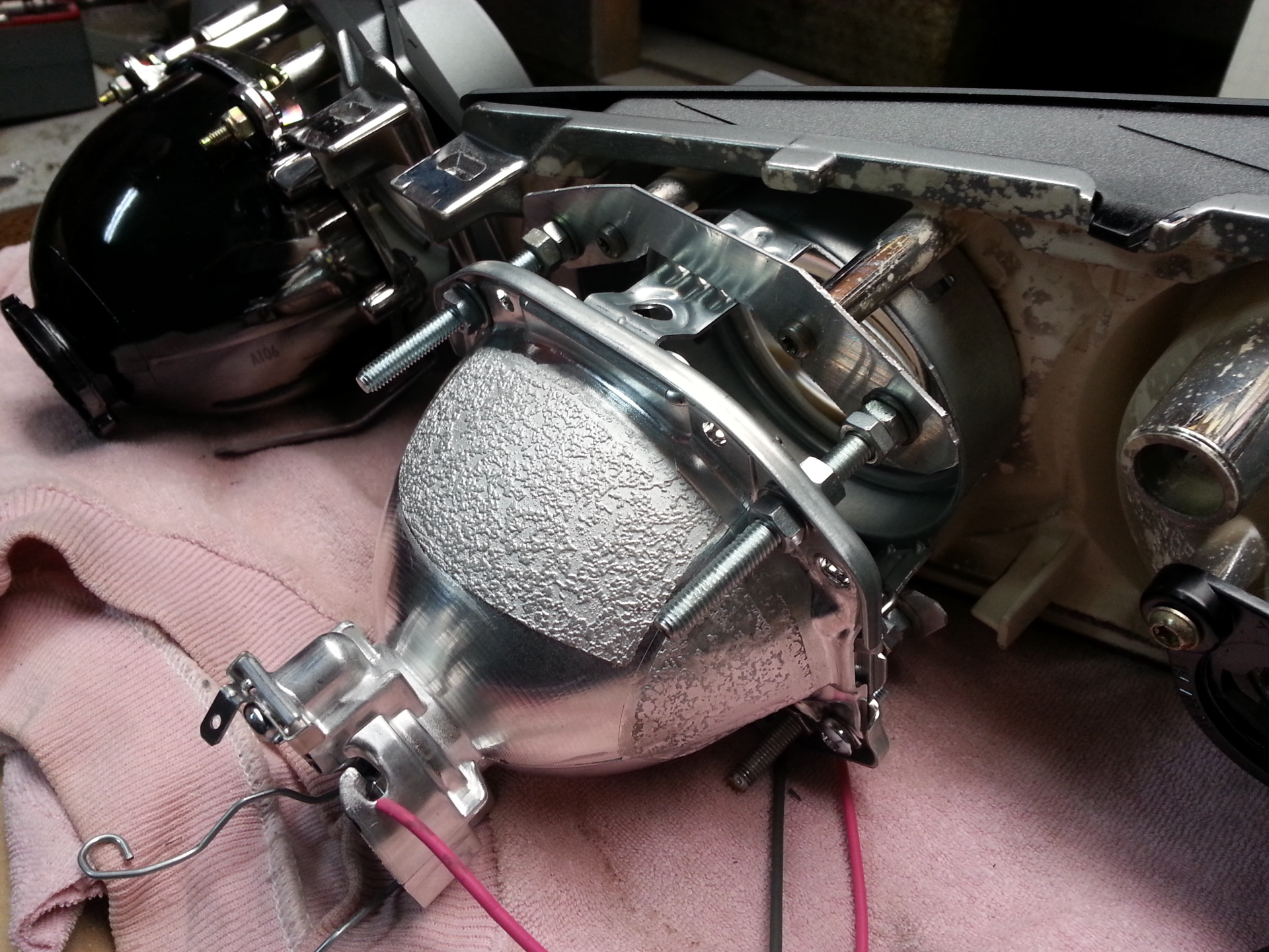 górny bolec trzymający fabryczny projektor trzeba wywalić i dorobić blaszkę trzymającą projektor od góry. Dolne podszlifować i skrócić.